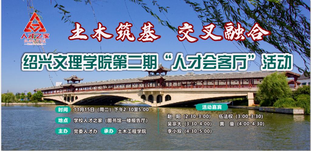 活动时间:11月15日(周二)下午2:30至5:00 活动地点:学校人才之家(图书馆一楼报告厅) 主办单位:党委人才办 承办单位:土木工程学院 活动嘉宾:赵 阳(2:30-3:00);伍法权(3:00-3:30)