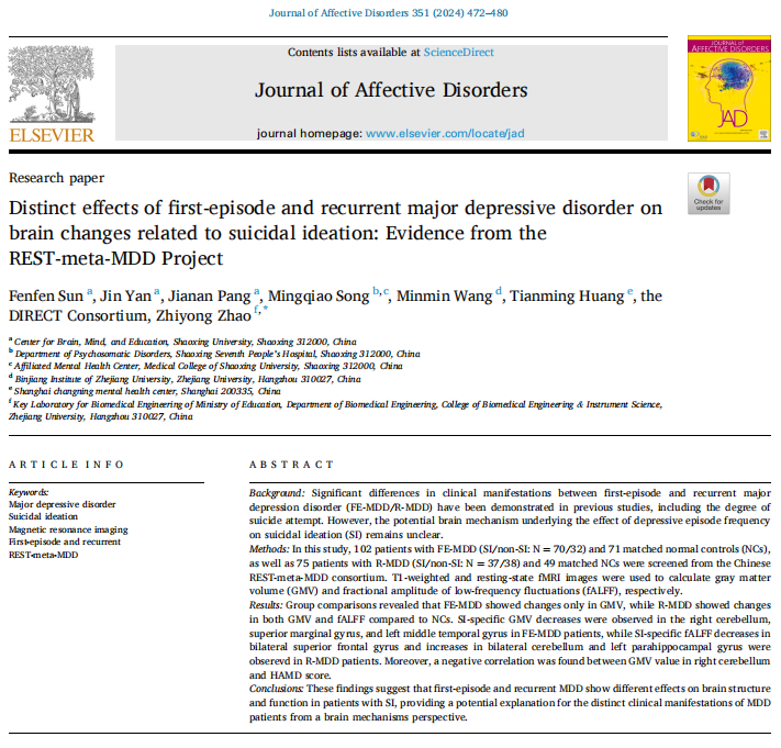 近日,我校大脑、心智与教育研究中心/心理学系孙芬芬博士在知名精神病学领域期刊Journal of Affective Disorders(SCI/SSCI收录,JCR Q1,中科院二区,TOP期刊,IF= 6.6)发表题为“Distinct effects of first-episode and recurrent major depressive disorder on brain changes related to suicidal ideation: Evidence from the REST-meta-MDD Project”的学术成果(文章链接https://doi.org/10.1016/j.jad.2024.01.213)。该研究是本中心首席专家陈巍教授领衔与绍兴市第七人民医院合作共建的“绍兴市第三批博士创新站”的一项重要成果。